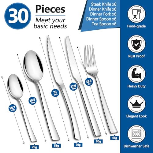 Specification: Homikit Cutlery Sets with Steak Knives, 30 Pieces Stainless Steel Flatware Set for 6 People, Included Knives Forks Spoons for Camping Kitchen Party, Non-Toxic, Mirror Polished & Dishwasher Safe