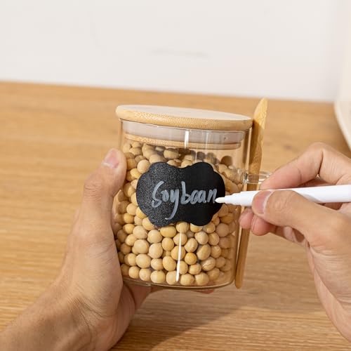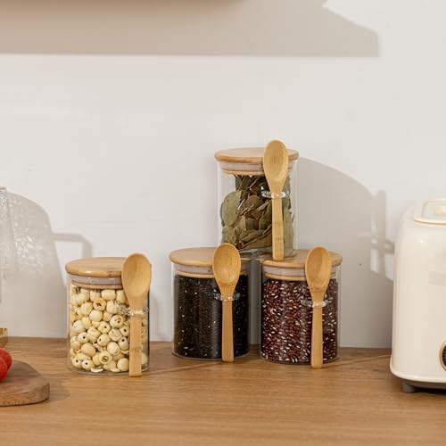 Specification: JOCHAMPS 4pcs Glass Jars with Spoons and Bamboo Lids Labels and Chalk, Kitchen Storage Jars for Spices Sugar Salt Tea Candies Jellies Herbs, Overnight Oats Breakfast Jars, 8.5 * 10cm(450ml)