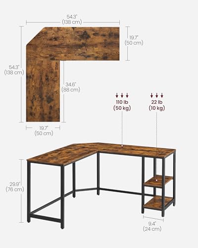 Specification: VASAGLE Computer Desk, L-Shaped Corner Desk, Gaming Desk, Workstation with 2 Storage Shelves for Home Office, Space-Saving, Easy to Assemble, Rustic Brown and Black LWD72X